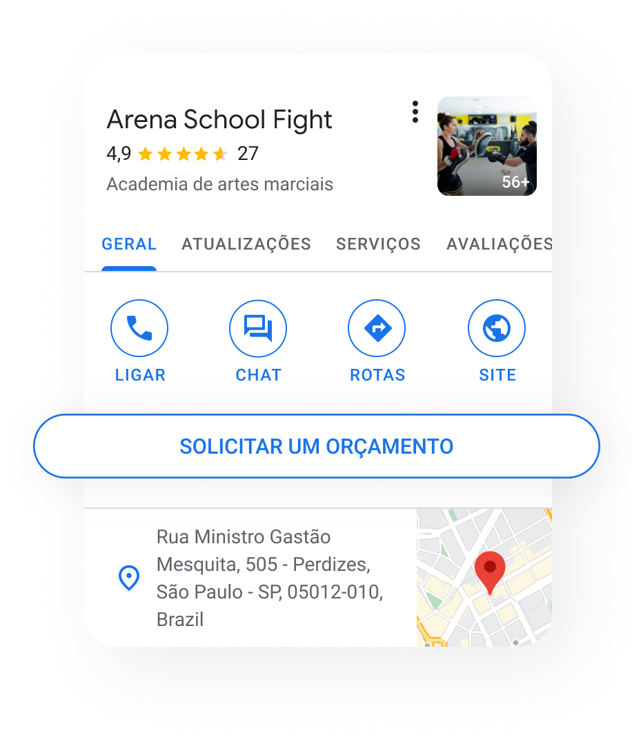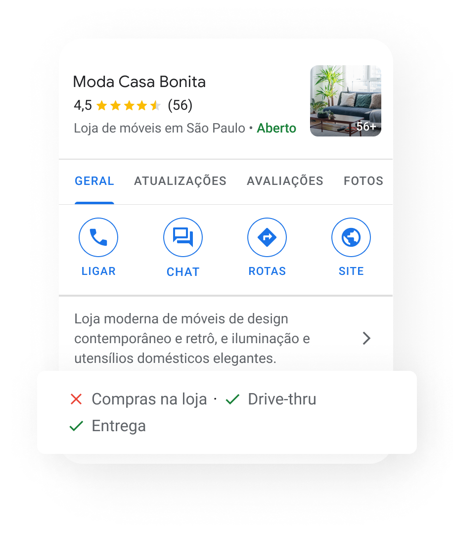 Transforme as pessoas que encontram você na Busca Google e no Maps em novos clientes com um Perfil da Empresa para seu estabelecimento físico ou sua área de cobertura. Customize seu perfil adicionando fotos, ofertas, postagens e muito mais.